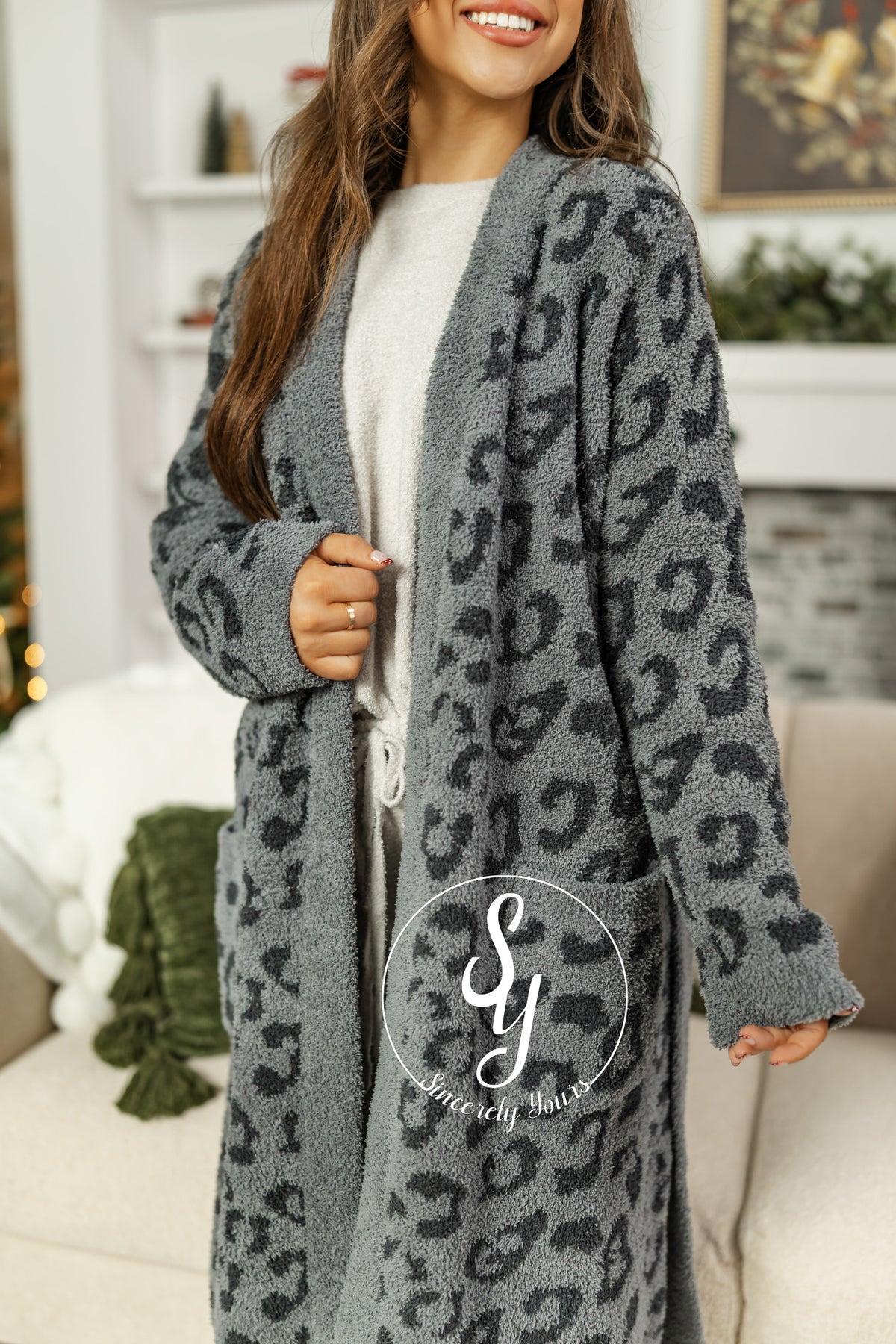 The looks of a cute cardi and the feels of a thick, cozy blanket, they've done it again and we are Barefoot Dreaming' ;) ! If you walk around the house in your blanket then this is the robe for you. It is the cutest graphite grey leopard pattern, with pockets! The tie is also removable in case you ever feel like dressing it up for a quick errand run (no one will know the difference!)