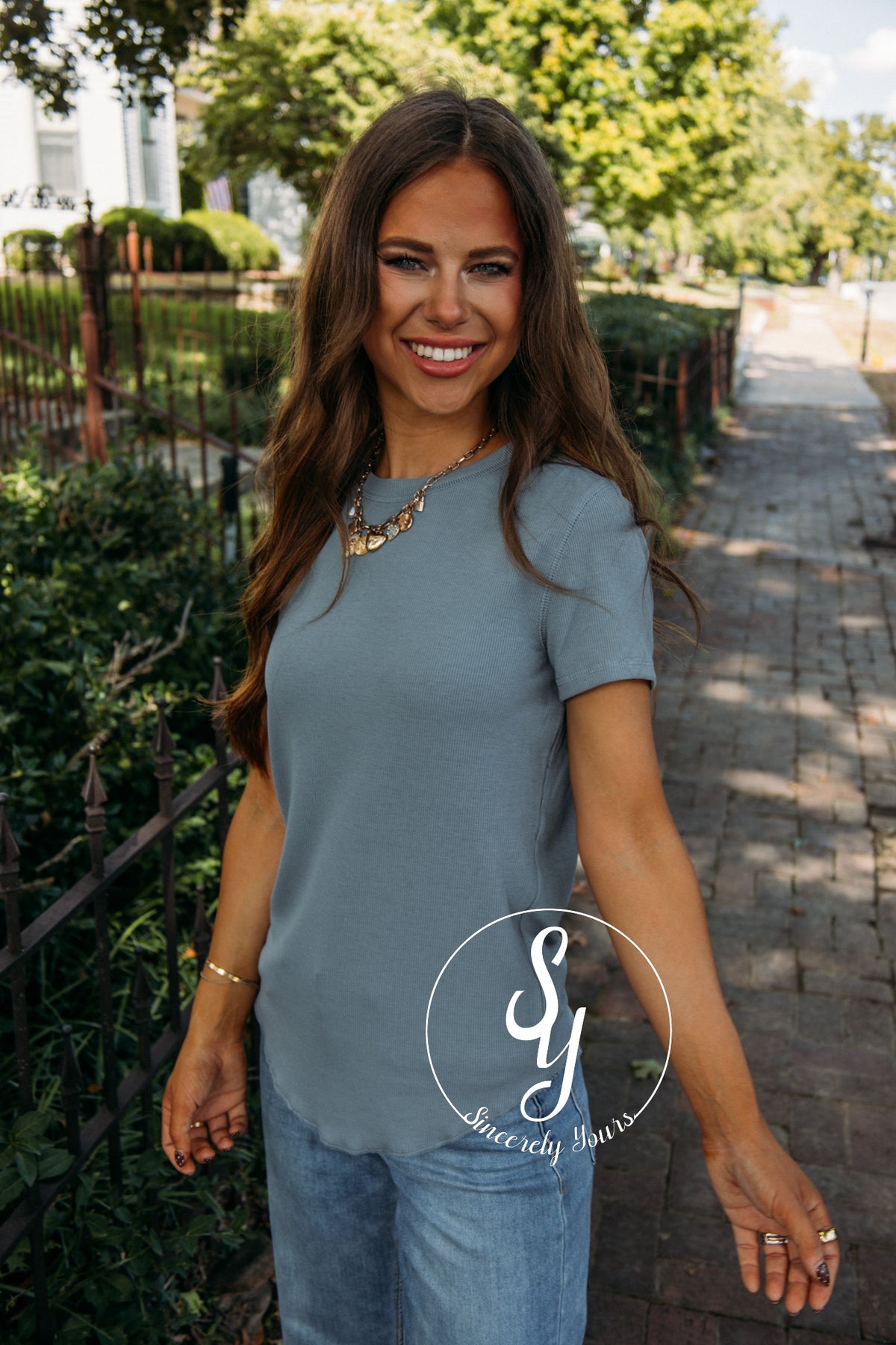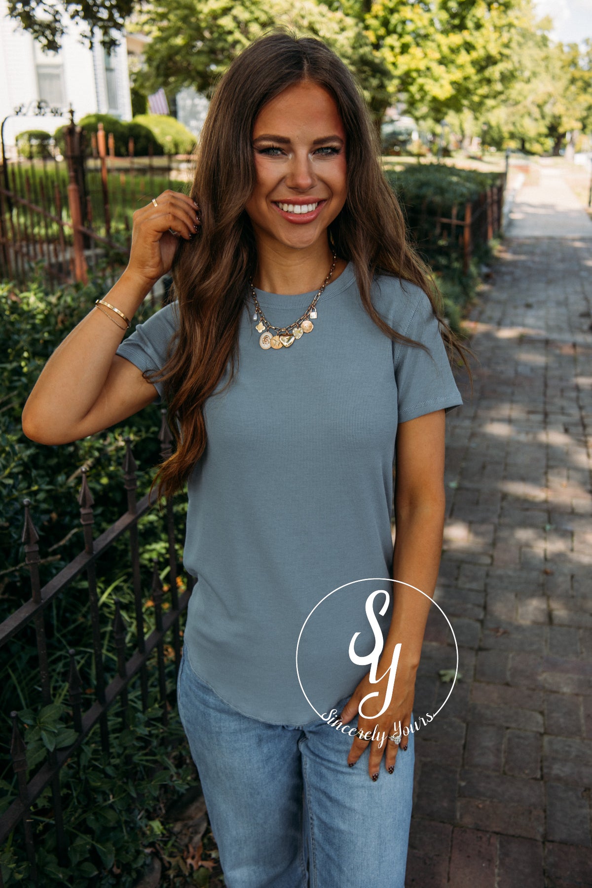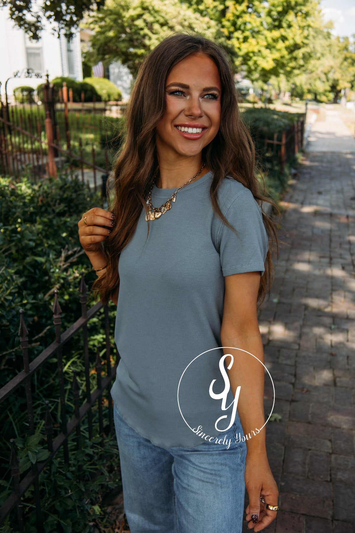 This pebble-colored ribbed top features short sleeves and a sleek, fitted design, making it the perfect base layer for any outfit! Whether you're slipping it under a cozy cardigan or a sharp jacket, it adds warmth and style! Easy to mix and match, it’s a playful staple for your wardrobe essentials!