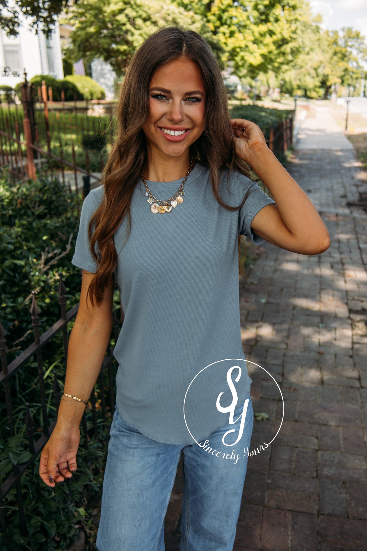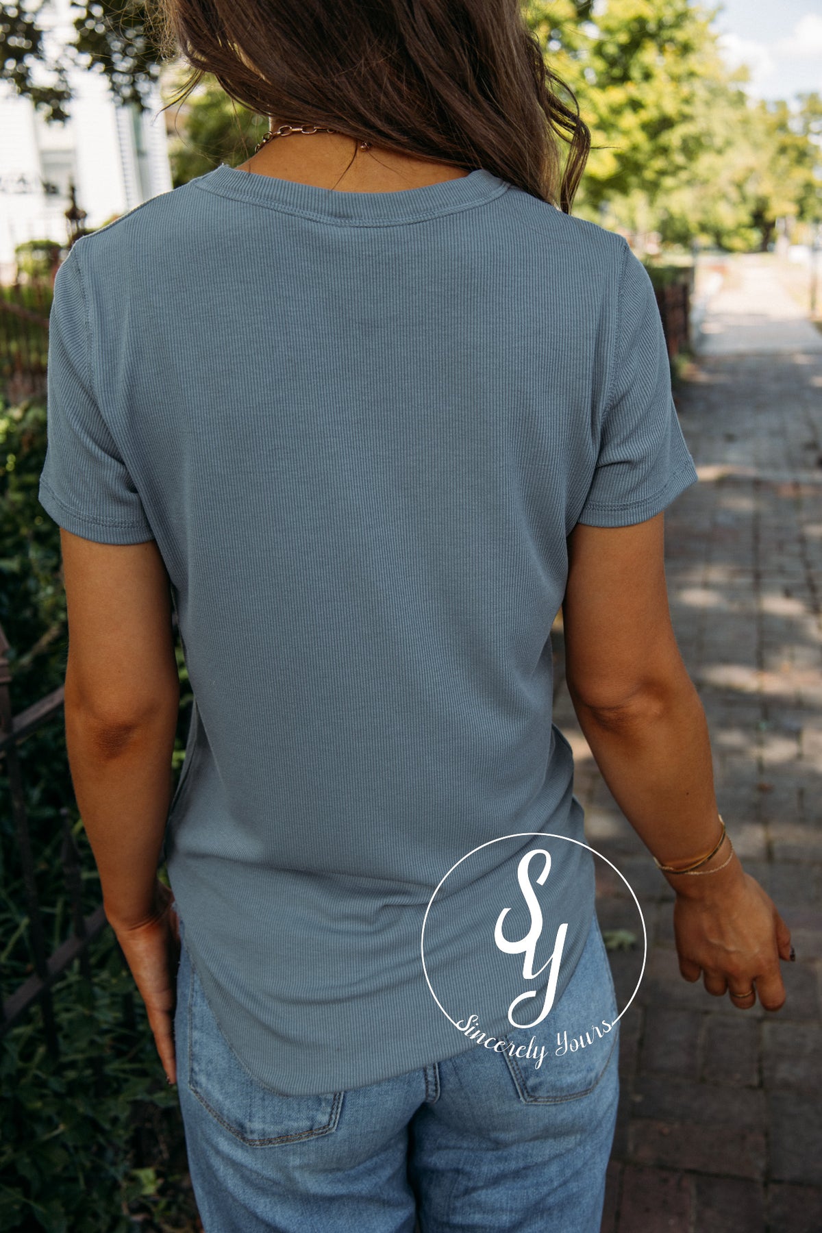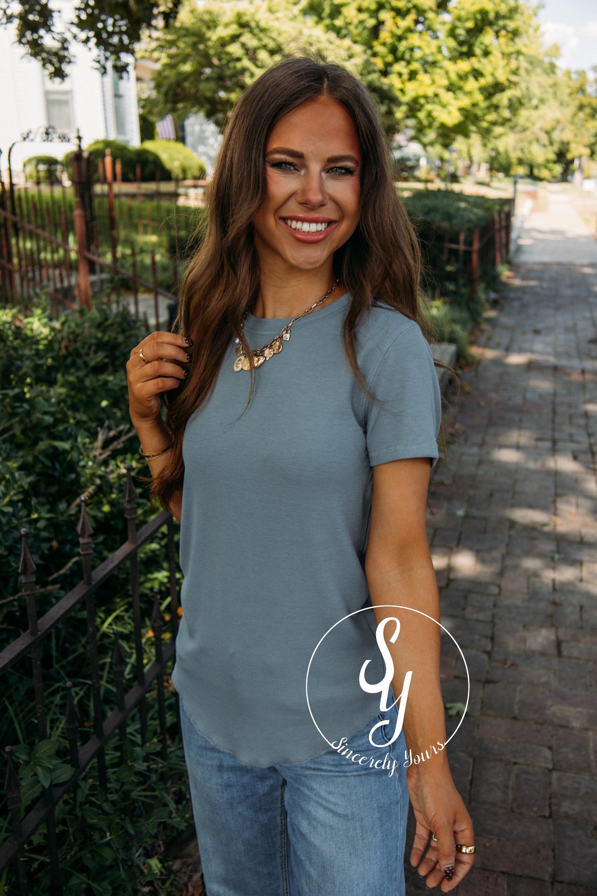 This pebble-colored ribbed top features short sleeves and a sleek, fitted design, making it the perfect base layer for any outfit! Whether you're slipping it under a cozy cardigan or a sharp jacket, it adds warmth and style! Easy to mix and match, it’s a playful staple for your wardrobe essentials!