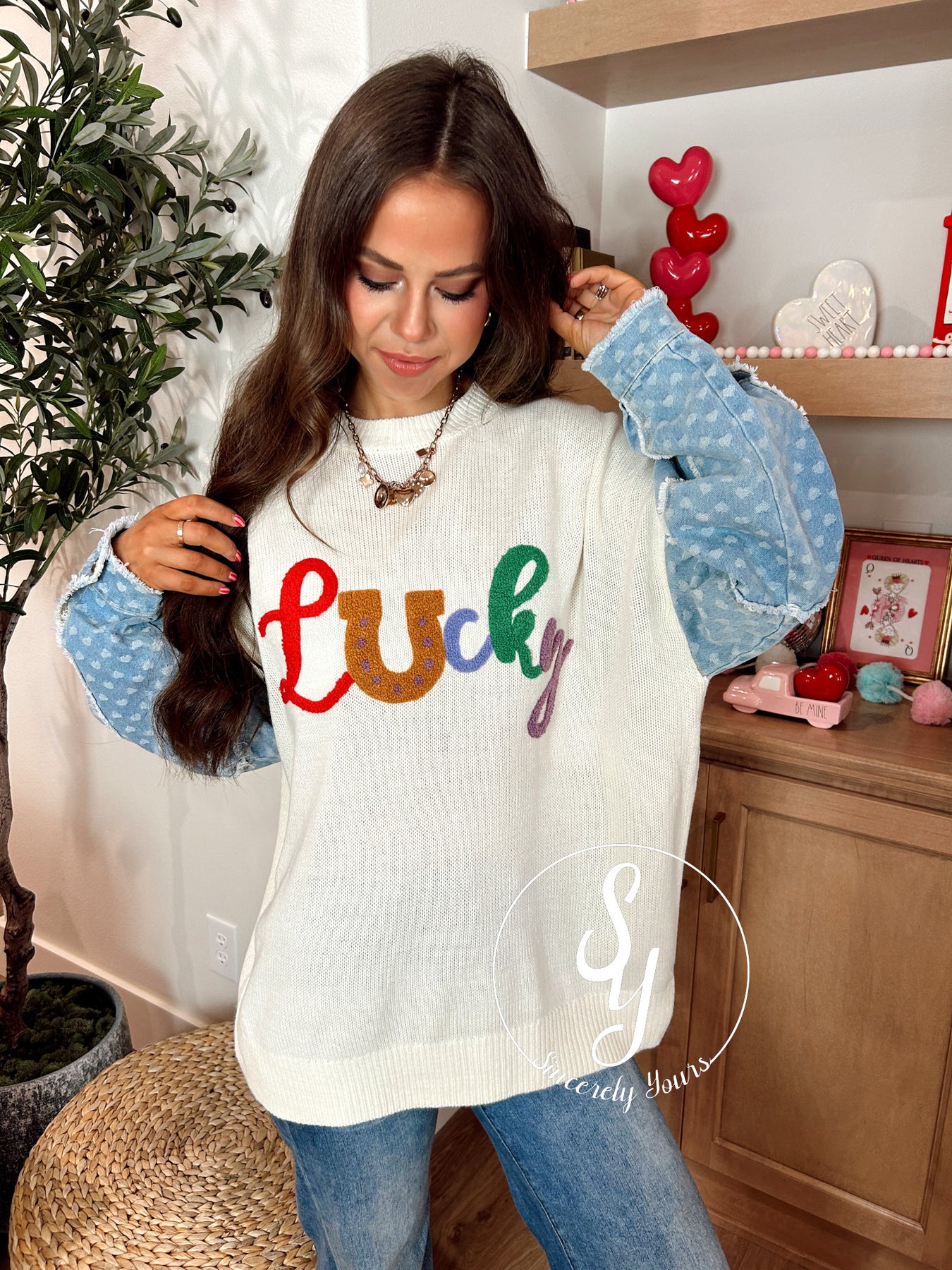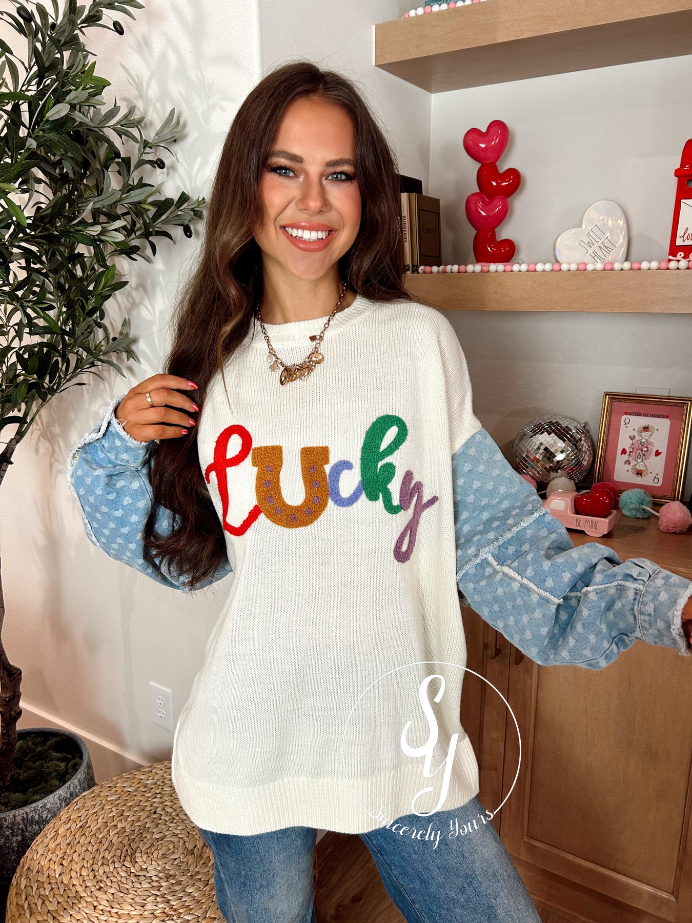 Feeling lucky in love? This charming ivory sweater brings the perfect blend of cozy comfort and unexpected style. The soft, neutral base pairs beautifully with eye-catching denim sleeves that add a playful twist to your everyday wardrobe. It's the kind of piece that makes you smile every time you put it on—effortlessly chic and totally unique.