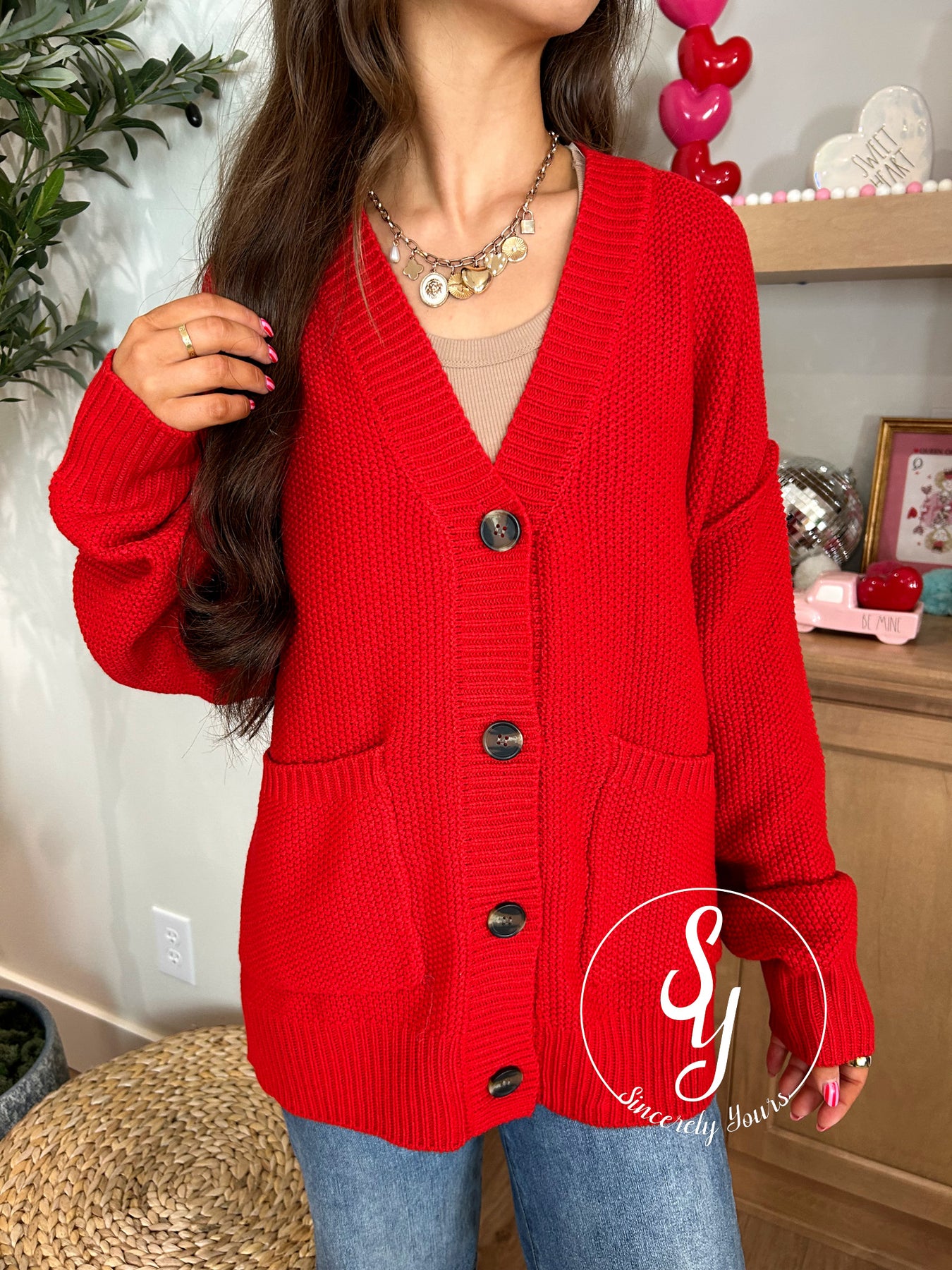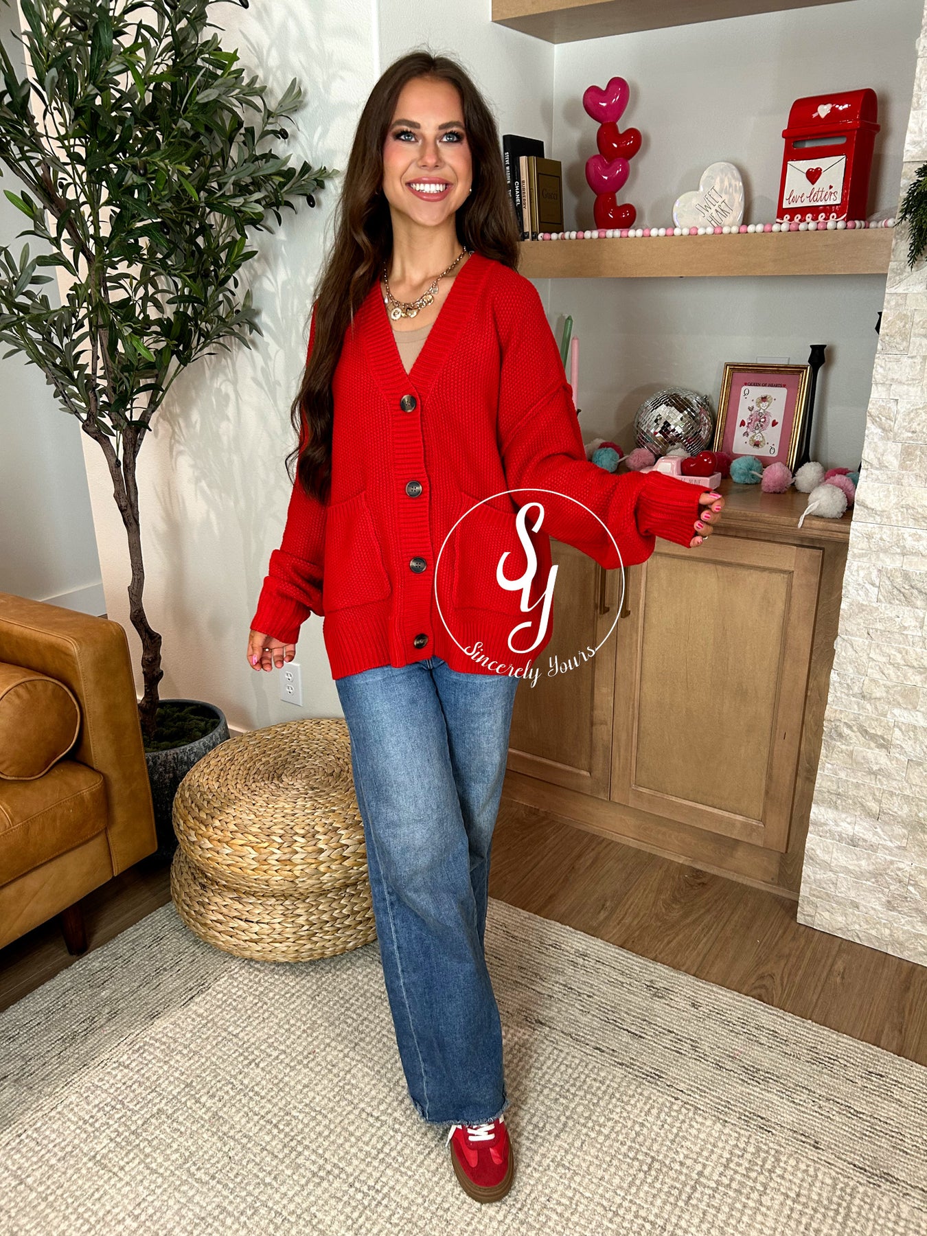 Wrap yourself in romance with the Mad In Love Cardigan in striking red. This beauty features thoughtful details that elevate your everyday style, from the rich crimson hue to the carefully crafted embellishments that catch the light just right. Perfect for layering over your favorite outfits, it's the kind of piece that makes you feel confident and effortlessly put-together. Whether you're dressing up or keeping it casual, this cardigan brings that perfect touch of charm to any look.