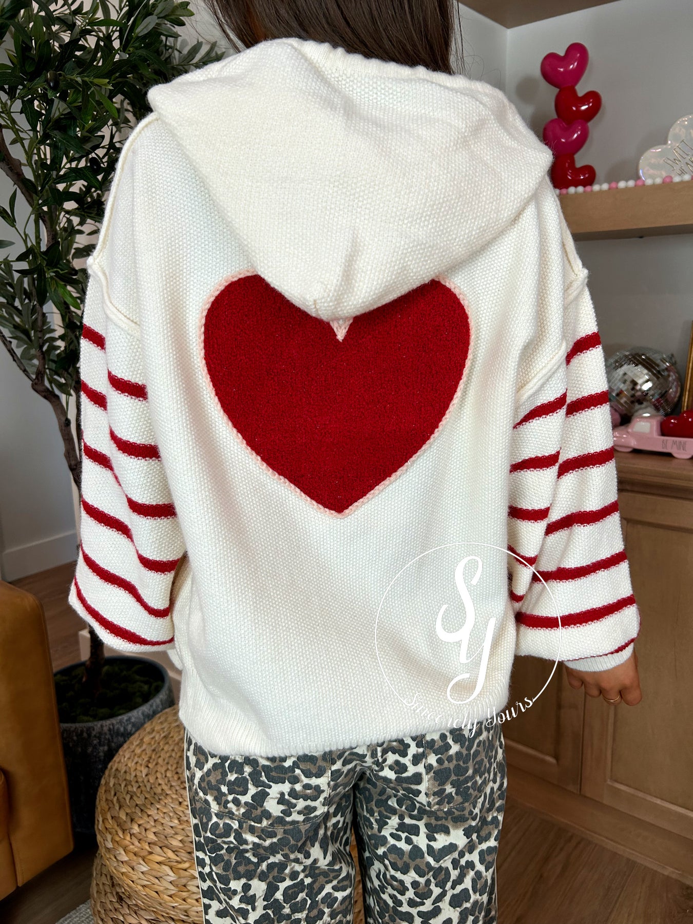 Wrap yourself in cozy comfort with this charming hooded sweater featuring delightful heart details. The soft ivory tone pairs beautifully with playful accents that bring warmth and personality to your everyday style. Perfect for layering or wearing solo, this sweater combines comfort with a touch of sweetness. Whether you're lounging at home or heading out, it's the perfect piece to express your fun side while staying snug and stylish.