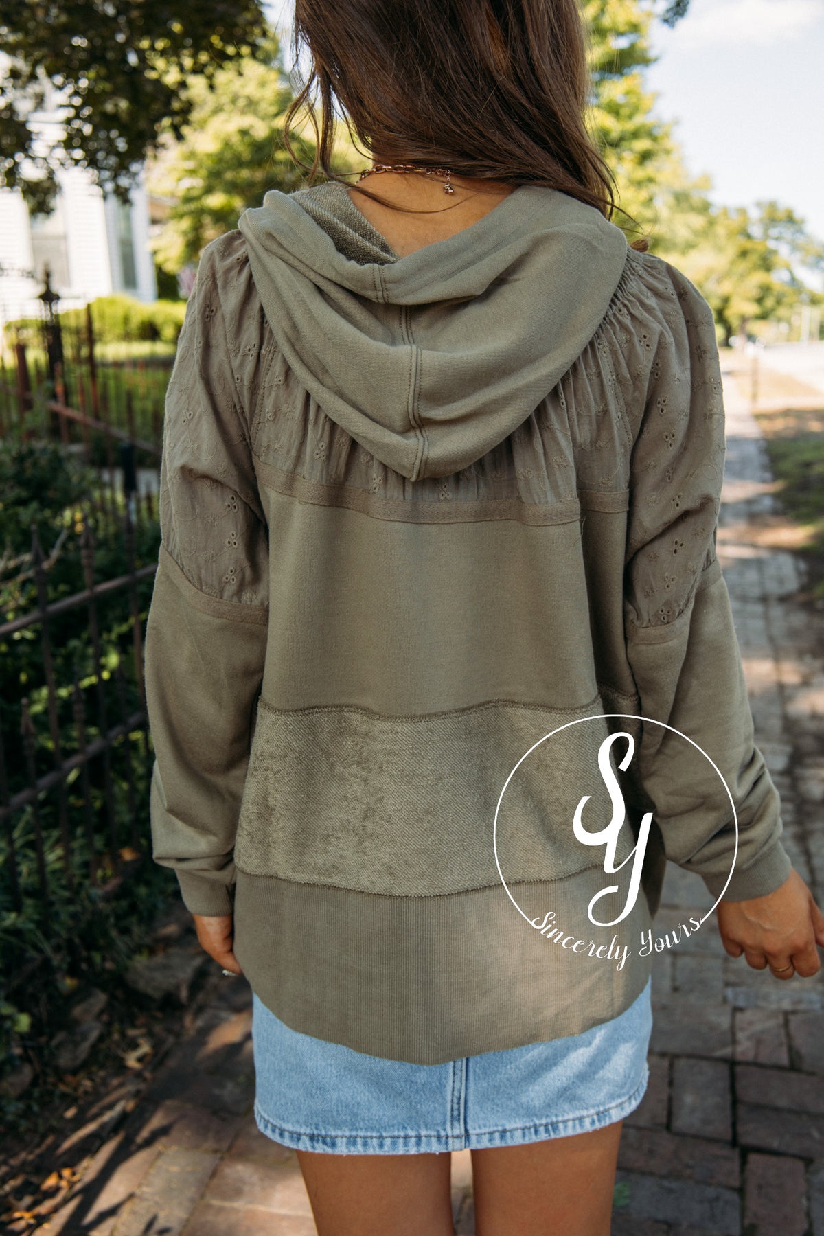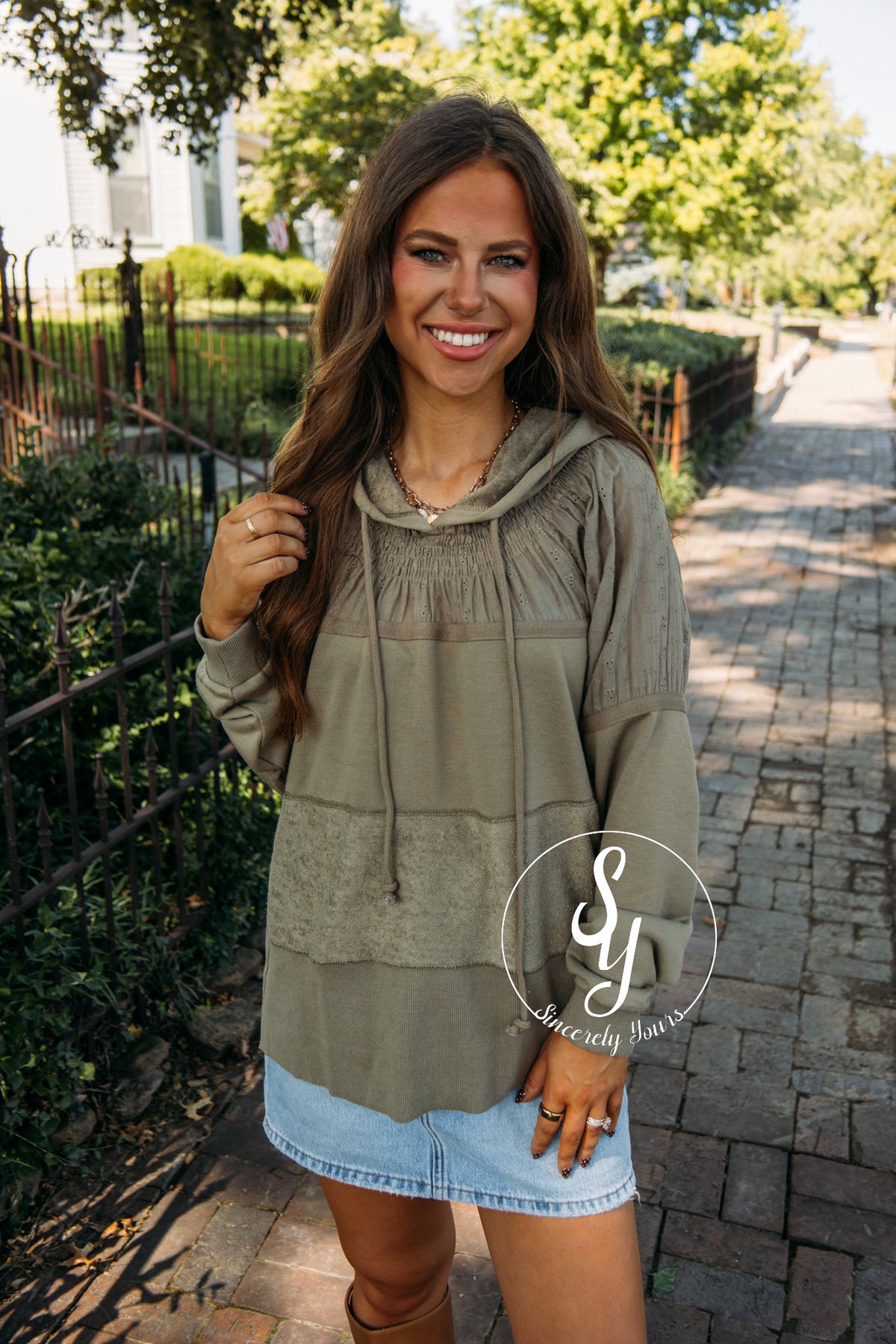Add a pop of charm to your wardrobe with the Shade Of Lovely Hoodie in Soft Olive. Its beautiful color and delicate lace detail turn this cozy favorite into the perfect playful piece to brighten any day. Comfortable and cute, it’s made to keep you smiling wherever you go.