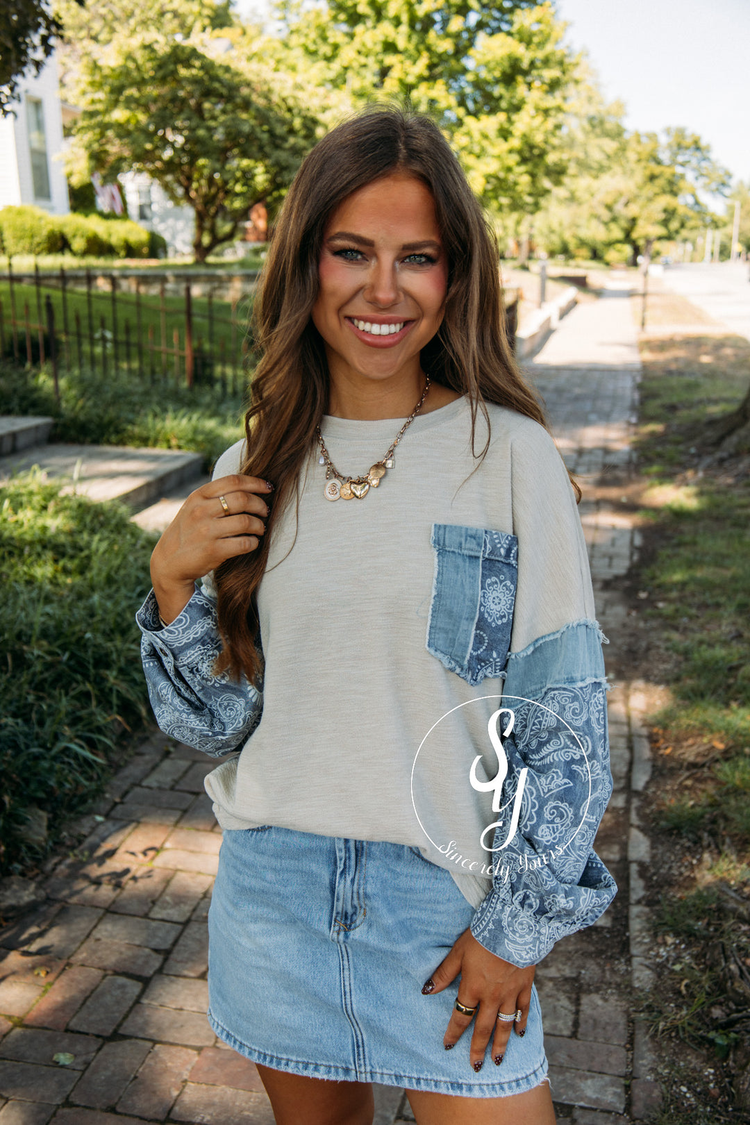 Denim Paisley Top- Khaki