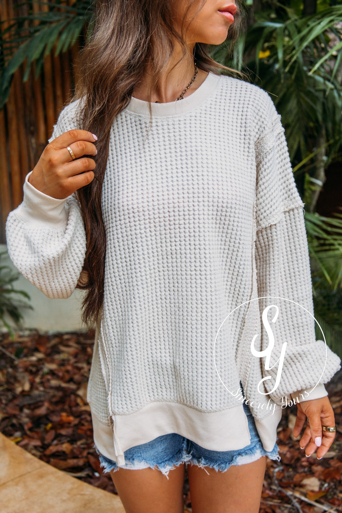 Wrap yourself in cozy charm with this adorable waffle knit top. The cream color is absolutely dreamy—soft, versatile, and perfect for layering or wearing solo. The textured waffle knit adds visual interest and a tactile element that feels as good as it looks. Whether you're strolling through town or curling up at home, this top brings effortless style and comfort to your everyday rotation.