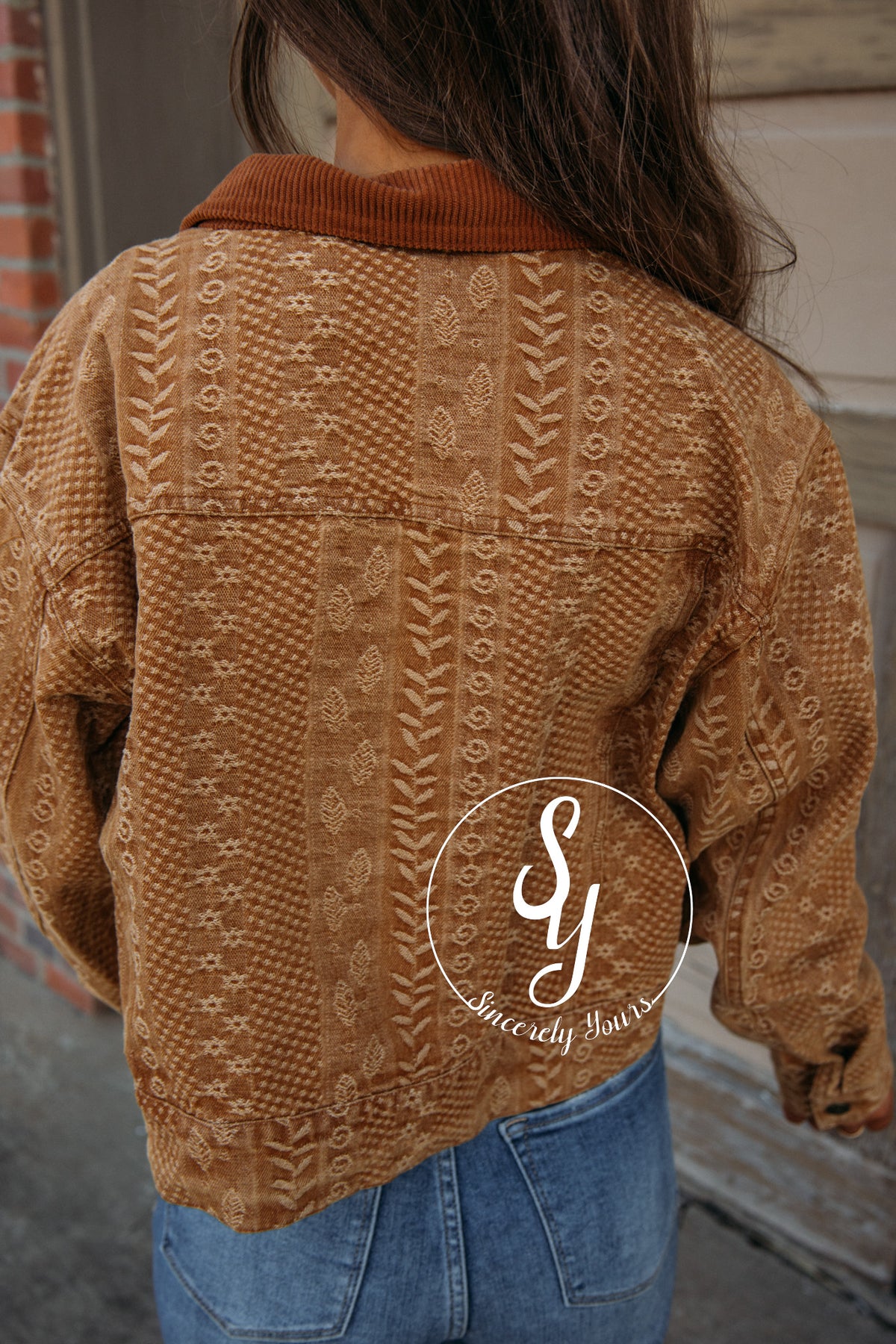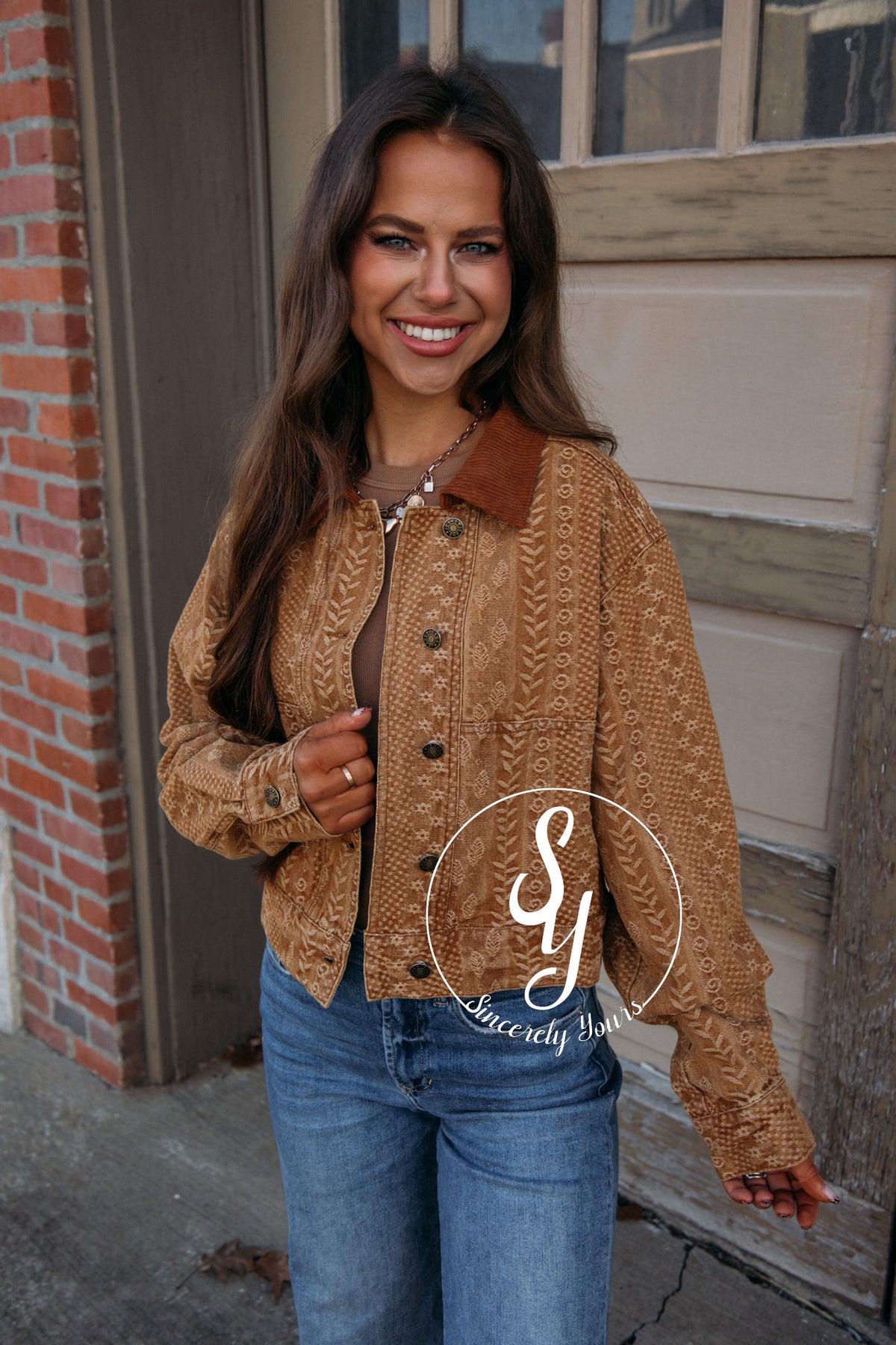 Slip into effortless style with the Juniper Floral Jacket. This camel and brown beauty combines timeless neutrals with an adorable floral detail that adds just the right amount of charm to your everyday look. Perfect for layering over your favorite tee or dress, it's the jacket that works as hard as you do—minus the boring part. Cozy, versatile, and undeniably cute.