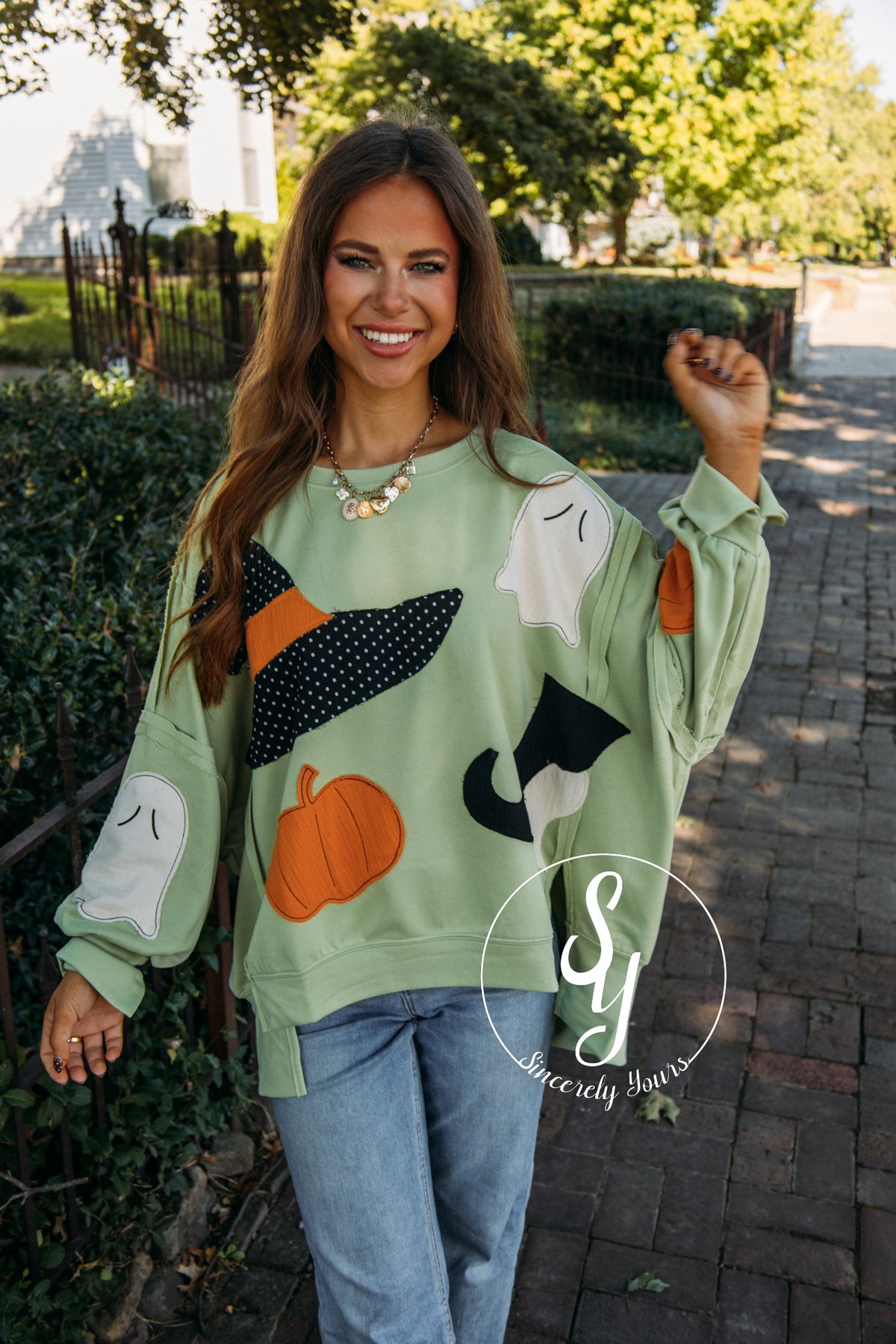 Celebrate the spooky season in style with this Halloween Patchwork Top in Light Olive. Featuring a fun mix of patterns, this crewneck brings cozy comfort with a playful twist. Perfect for festive gatherings or casual fall days, it adds a unique, cheerful vibe to your seasonal wardrobe.