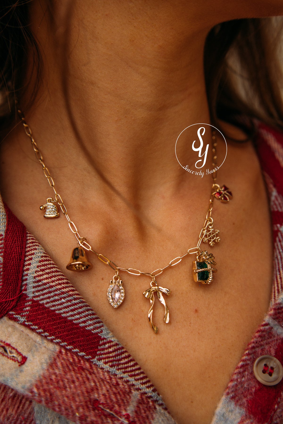Jingle all the way into the season with this festive Christmas charm necklace. Adorned with delightful holiday-themed charms in shimmering gold, it's the perfect way to express your yuletide spirit. From cozy sweaters to elegant evening wear, this necklace is your ticket to spreading seasonal joy wherever you go!