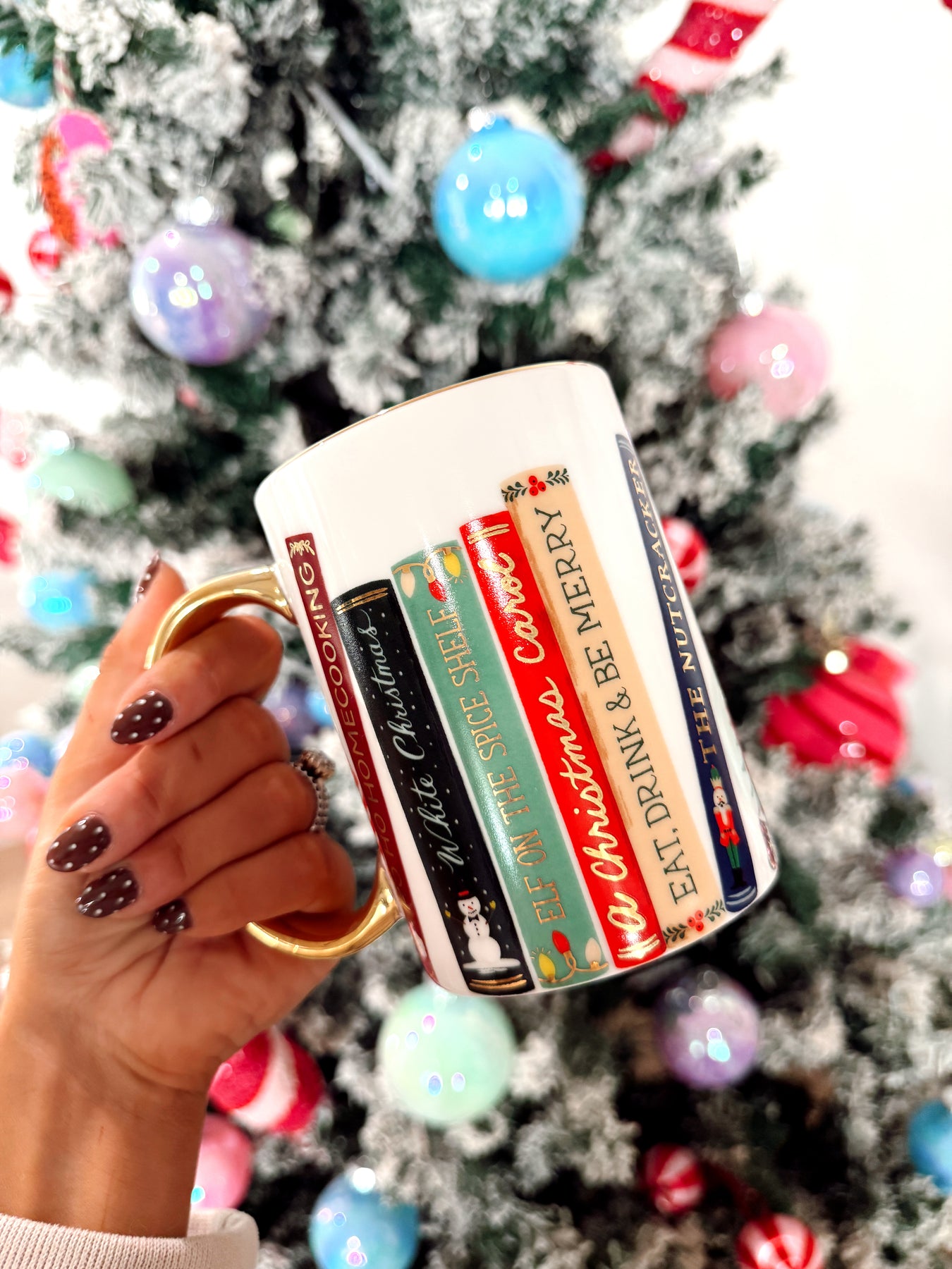 Our porcelain mugs feature illustrated designs with gold accents and a gilded rim and handle to add a festive touch to your favorite beverage.