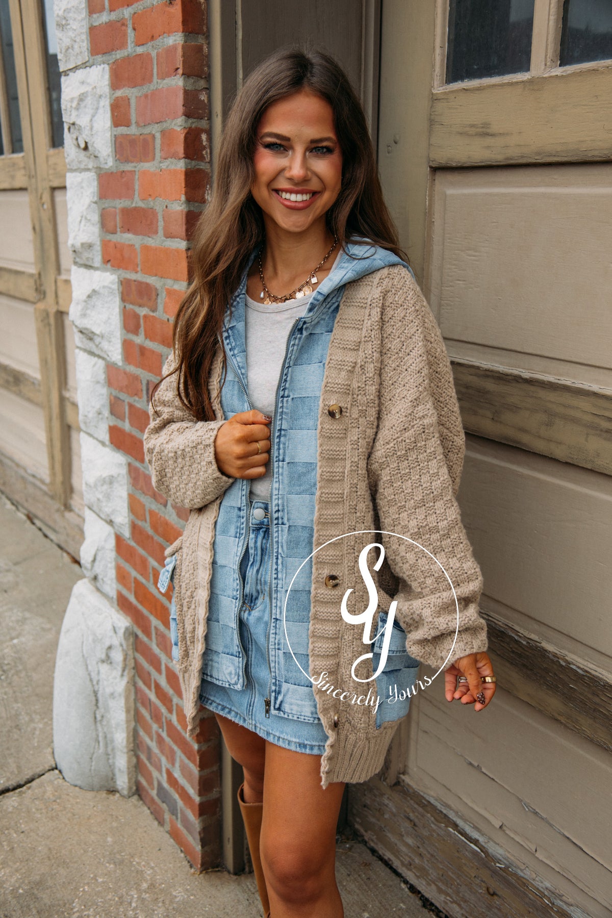 Layer up with the Sweater Love Cardigan, where playful textures meet effortless style. This latte and denim beauty features a delightful mix of knit details that add visual interest and dimension to any outfit. Perfect for those who love a little personality in their wardrobe, this cardigan brings fun and comfort together in one cozy piece.