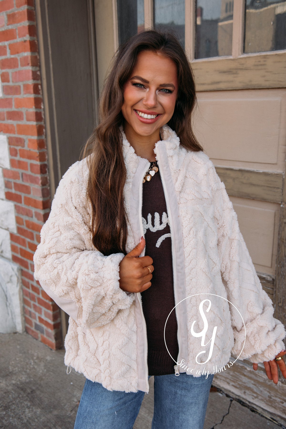 Say goodbye to boring winter layers! This Aztec Fuzzy Jacket in dreamy ecru is your new best friend—soft, snuggly, and ready to play nice with literally everything you own. Throw it over your favorite outfit for instant coziness without the fuss. Whether you're bundling up for a crisp day out or just want to feel like you're wrapped in a cloud, this fuzzy wonder has your back. Winter just got a whole lot more fun.
