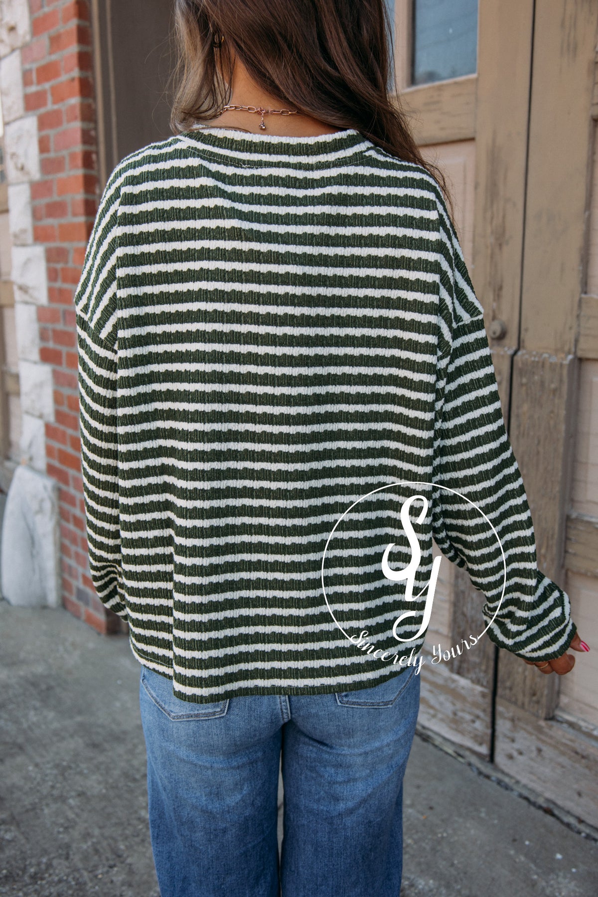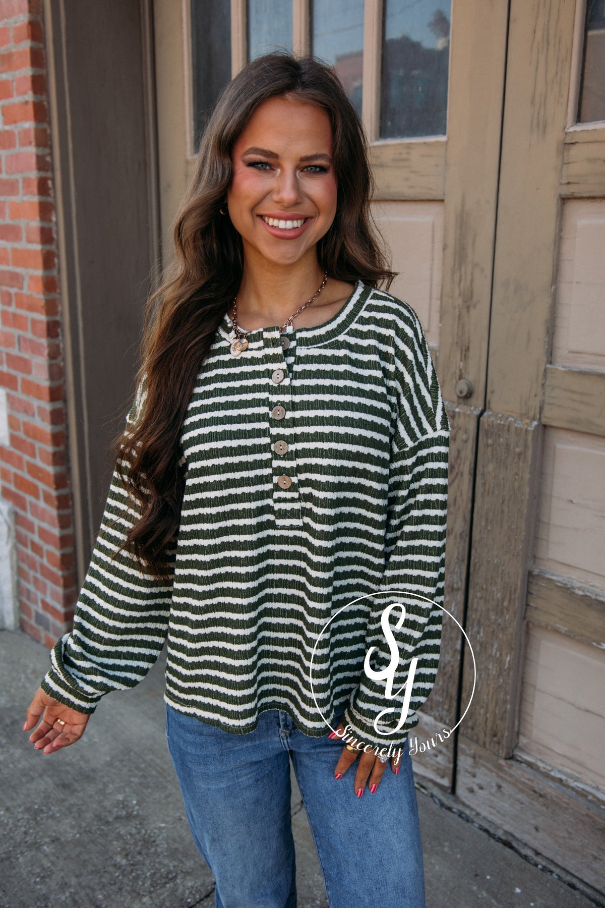 This Is It Top in olive is absolutely adorable! The charming stripe detailing adds visual interest and dimension, while the button front gives it a classic, polished vibe that works for everything from casual outings to dressier occasions. The neutral taupe shade is endlessly versatile—pair it with jeans for effortless style or dress it up with trousers for a put-together look. It's the kind of piece that becomes an instant favorite in your rotation because it's both cute and incredibly wearable.