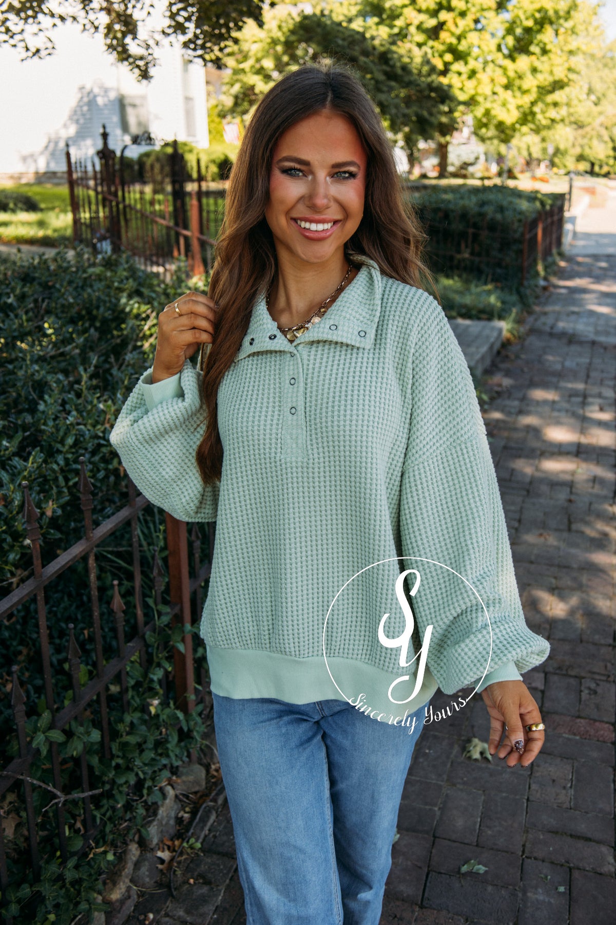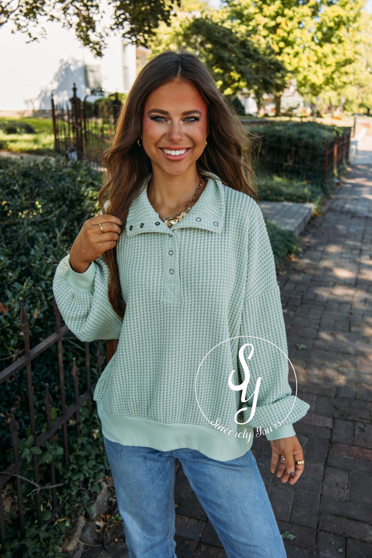 Start your day in the cozy Morning Hike Top in soft sage, designed with a fun waffle knit texture and charming buttons for a playful touch. It’s the perfect mix of comfort and style to keep you smiling on all your adventures.