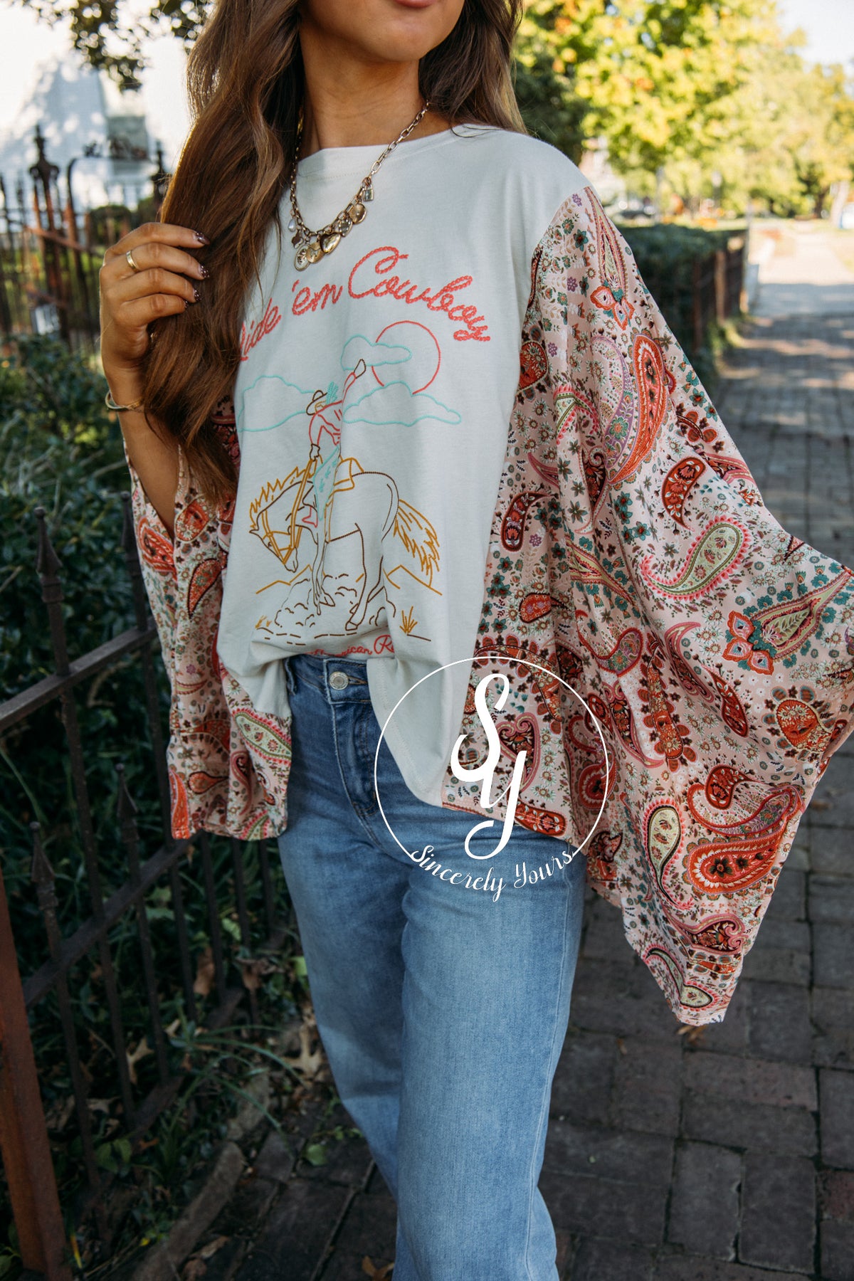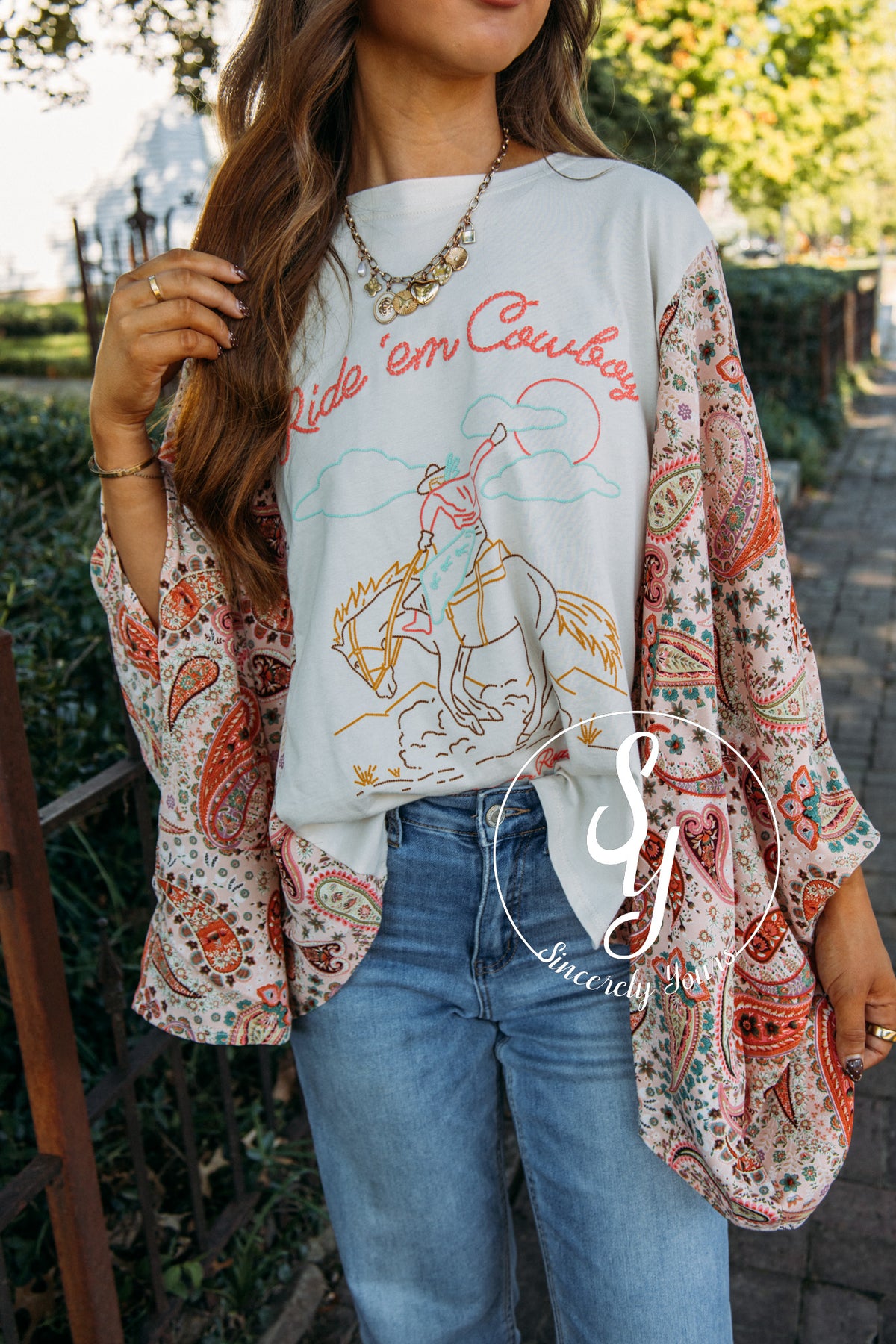 Get ready to turn heads with the Ride Em' Cowboy Graphic top in Bone! Bursting with vibrant colors and bold graphics, this top brings a playful, spirited vibe to your wardrobe. Perfect for adding a pop of fun to any outfit, it’s made to keep your style lively and adventurous all day long. Saddle up and let your personality shine!