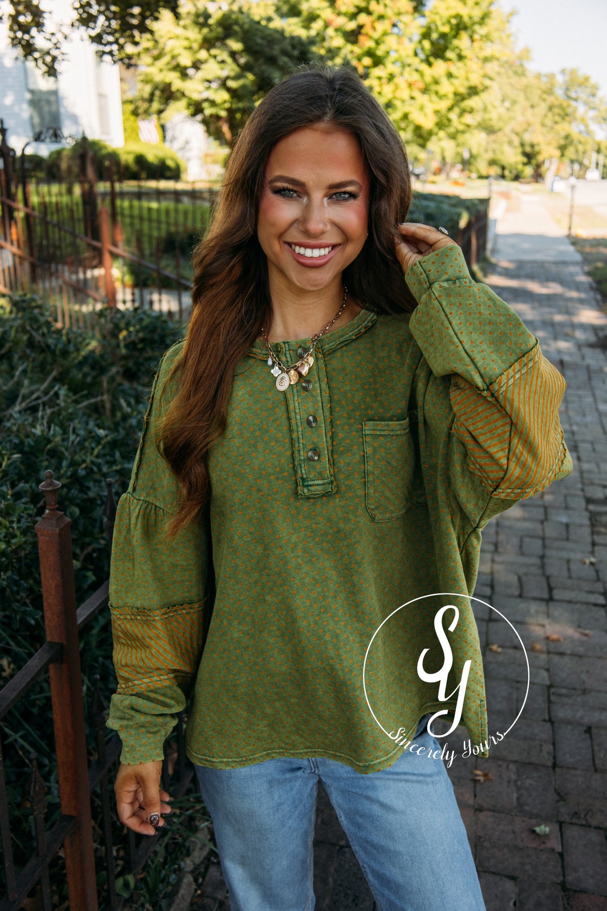 The Stripe A Dot Top in Juniper Green is a delightful mix of playful polka dots and bold stripes, making it a fun and charming addition to your wardrobe. Its unique pattern adds a touch of whimsy that’s perfect for brightening any day. Embrace the joy this top brings with its cheerful design and comfy fit!